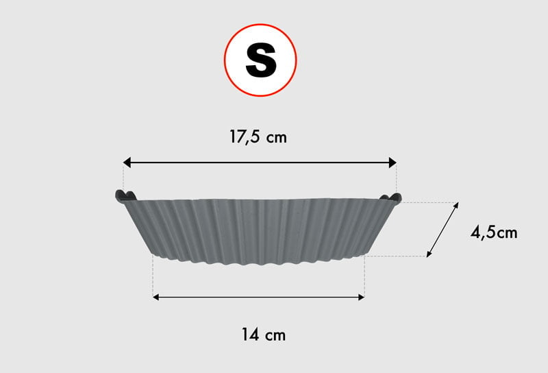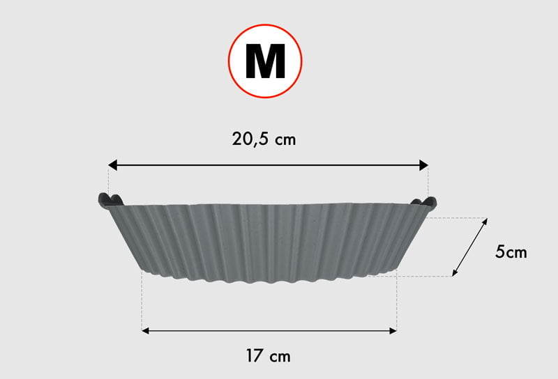 Rinkinį sudaro 3 vnt.: S, M ir L dydžio silikoninės kepimo formos (žr. išmatavimus žemiau) ir daugkartinio naudojimo maišelis.